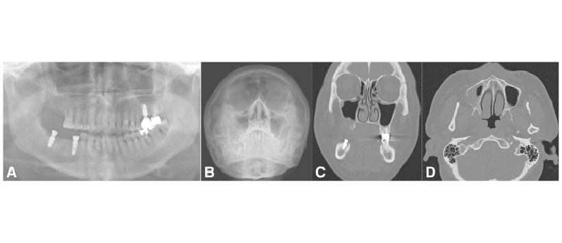Figura 3: La fístula oronasal crónica después de la extracción del segundo molar con varios puntos de reabsorción ósea alveolar indica sinusitis maxilar odontogénica. Vistas panorámicas preoperatorias (a), de Water (b), TC coronal (c) y TC axial (d)