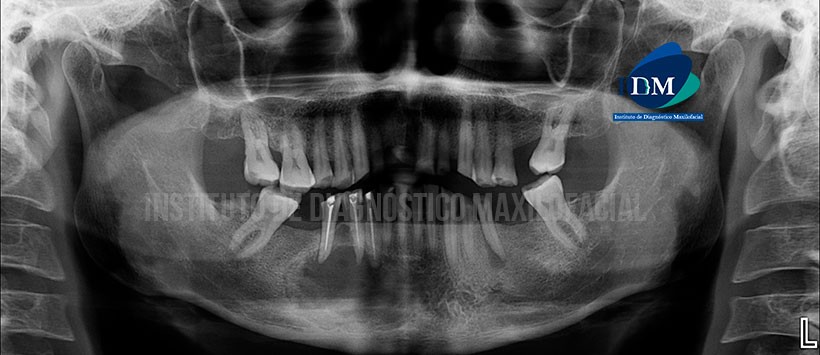 A la evaluación de la radiografía panorámica se aprecia una imagen radiolúcida de limites parcialmente definidos, localizado en zona parasinfisiaria y parte del cuerpo mandibular de lado derecho, también se evidencia un leve aumento de la densidad ósea circundante, borramiento de las corticales del conducto dentario inferior, agujero mentoniano y lamina de dura de las piezas 43, 44 y 45, las cuales a su vez presentan material de obturación de conductos. (Figura 1)