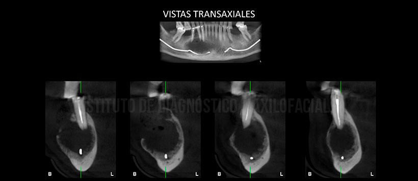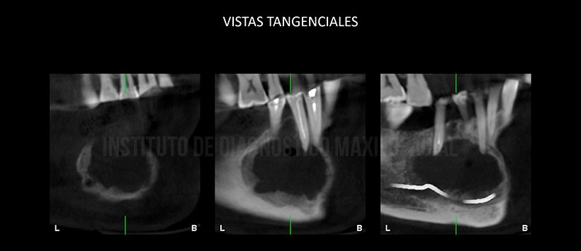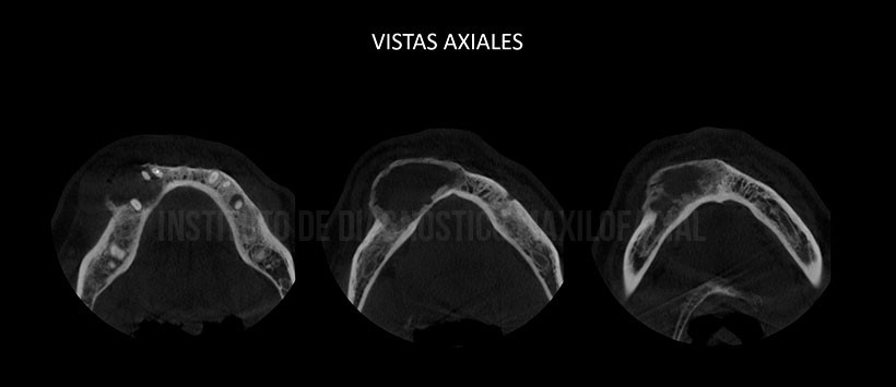 A la evaluación de la tomografía volumétrica de haz cónico (Figura 2, Figura 3 y Figura 4) se evidencia que dicha lesión se extiende desde la pieza 41 hasta mesial de la pieza 47, una disminución de la densidad ósea en su configuración interna, así mismo se observa un leve desplazamiento hacia el reborde basal del conducto dentario inferior, expansión de ambas tablas óseas (a predomino de la tabla ósea vestibular). Así mismo se visualiza una imagen hipodensa de forma redondeada dentro de la lesión (enfisema) a consecuencia de la manipulación en zona de la tabla ósea vestibular (perdida de continuidad).