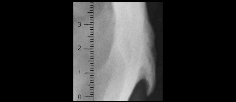 Se solicita radiografía lateral de columna cervical, abarcando cráneo (Figura 1) observando entesofito en la inserción del ligamento nucal a nivel de su inserción occipital (Figura 2).