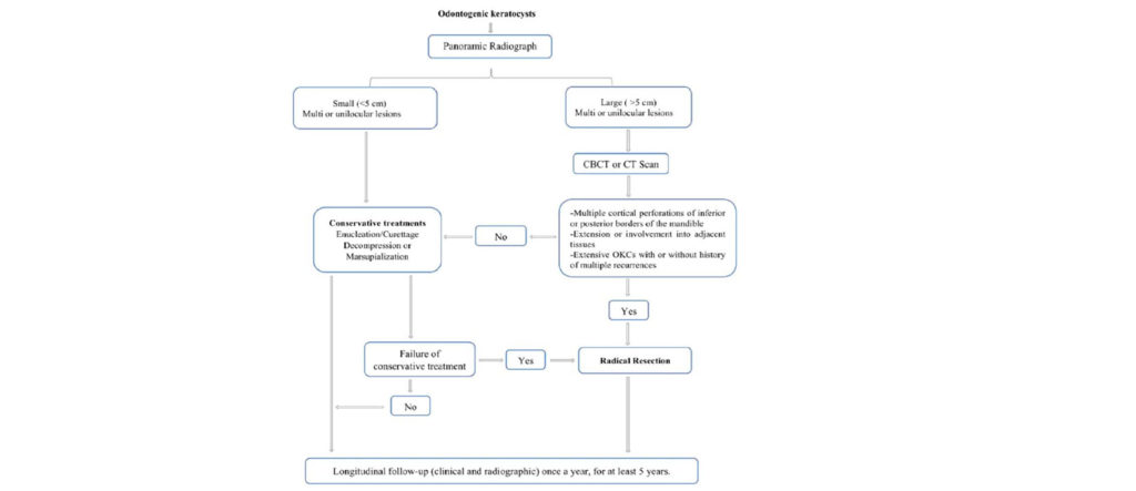 - Figura 1: Protocolo frente a situaciones clinicas para el adecuado manejo del Queratoquiste Odontogénico, es imprescindible los examenes por imágenes como la panorámica y la tomografía computarizada de haz cónico (TCHC).