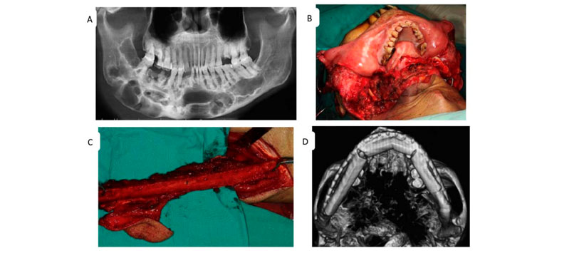 - Figura 2: Las características del QO determinaron el régimen de tratamiento. (A) Una radiografía panorámica preoperatoria de una gran lesión multilocular que se extiende desde el tercer molar izquierdo hasta la rama ascendente contralateral de la mandíbula. Vistas intraoperatorias de (B) una mandibulectomía segmentaria y (C) el colgajo del peroné. (D) Imagen de la mandíbula reconstruida después de la cirugía.