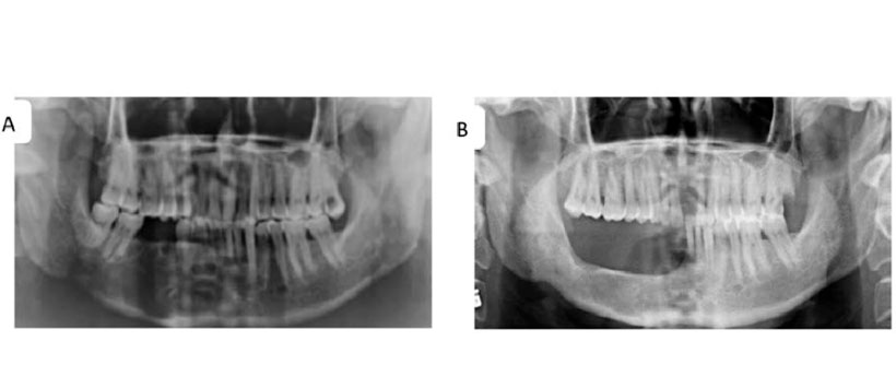 - Figura 3: Mandibulectomía marginal de un Queratoquiste recurrente de la mandíbula derecha. (A) Radiografía panorámica muestra múltiples lóculos con una delgada línea esclerótica en el hueso alveolar de los dientes anteriores mandibulares derechos, el segundo premolar y los primeros sitios de extracción molar, lo que indica recurrencias. (B) Radiografía panorámica luego 18 meses después de la cirugía.
