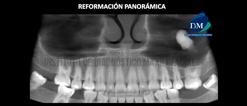 En la reformación panorámica del maxilar superior (Figura 1) se aprecia neumatización alveolar de ambos senos maxilares con presencia de una imagen hiperdensa en el antro maxilar izquierdo. Además, se aprecia múltiples restauraciones y ausencia de piezas dentarias.