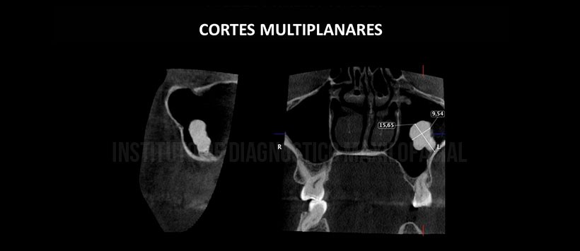 A la evaluación de la tomografía volumétrica (CBCT) en cortes multiplanares (Figura 2), axiales (Figura 3), se observa imagen hiperdensa de densidad de hueso cortical, forma irregular, límites definidos, de apariencia “pediculada” en contacto con el contorno de las paredes anterior y posterior del seno maxilar izquierdo. Presenta una dimensión de 15.65×9.54mm y de un volumen de 0.765cm3 (Figura 4).