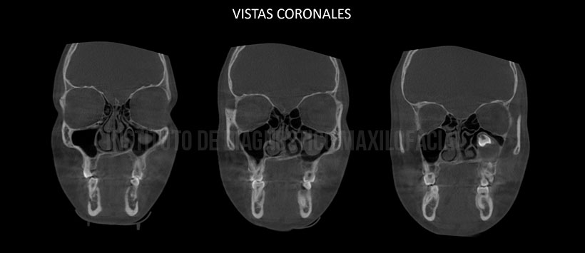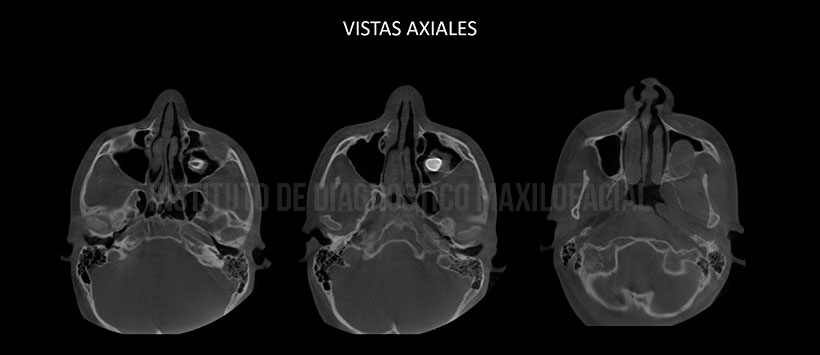 En la tomografía volumétrica de haz cónico se evidencia dicha entidad dentro del seno maxilar izquierdo, asociada y desplazando a la pieza previamente mencionada hacia piso de fosa orbitaria. Así mismo esta comprometiendo parte del piso y pared posterior de seno maxilar. (Figura 2, Figura 3 y Figura 4)