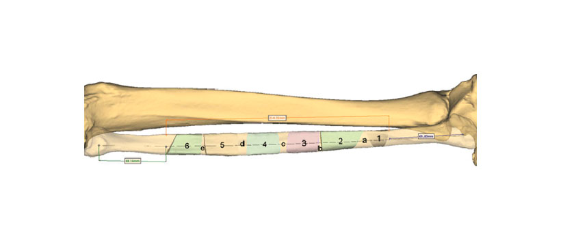 La resección mandibular virtual fue seguida por la reconstrucción virtual del defecto mandibular resultante con un colgajo de peroné que consta de seis segmentos. Este procedimiento semiautomático consistió en dividir el defecto del hueso mandibular en seis unidades con el fin de posicionar los segmentos de peroné de tal manera que pudieran llenar el defecto de manera apropiada. Después de determinar los extremos distales y proximales del sitio de osteotomía fibular, el colgajo de peroné se colocó virtualmente en el defecto utilizando un algoritmo de software (Fig. 3). Como un peroné es un hueso recto, se deben cortar cuñas del hueso para permitir que se cree la forma deseada de la mandíbula. Las líneas y los ángulos de osteotomía fueron determinados automáticamente por el software (Fig. 4). Después de un posicionamiento rugoso automático de las piezas de hueso, el ingeniero de planificación colocó manualmente los segmentos de peroné en su posición exacta al final del procedimiento de reconstrucción mandibular virtual.