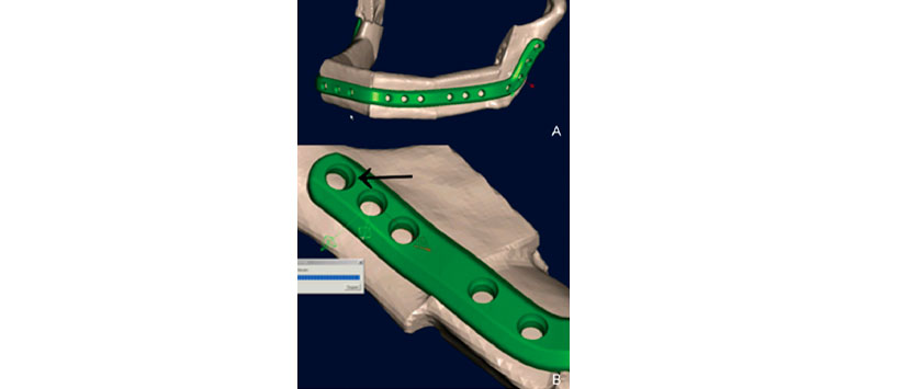 Luego se utilizó un modelo virtual de la mandíbula reconstruida que se había generado sobre la base de la planificación asistida por computadora para la planificación asistida por computadora de una placa de reconstrucción utilizando el software CAD patentado por DePuy Synthes. La posición de la placa a lo largo de la superficie externa del modelo virtual de reconstrucción mandibular fue definida por el ingeniero (DePuy Snythes) de acuerdo a la planificación de los cirujanos. Luego, una placa de 2.5 mm se formó virtualmente sobre la base del modelo utilizando un algoritmo de software especial. Se pueden seleccionar diferentes números, tamaños y ángulos (máximo: 15 grados) de orificios para tornillos (Fig. 5). La placa descrita aquí tenía 24 agujeros. Los agujeros en las regiones de la rama derecha e izquierda estaban angulados (15 grados) en dirección craneocaudal (Fig. 5). Además, la longitud requerida o deseada de cada tornillo se determinó mediante simulación por computadora. En el caso presentado aquí, se colocaron tornillos bicorticales en el hueso mandibular residual y tornillos monocorticales en los segmentos de peroné.
