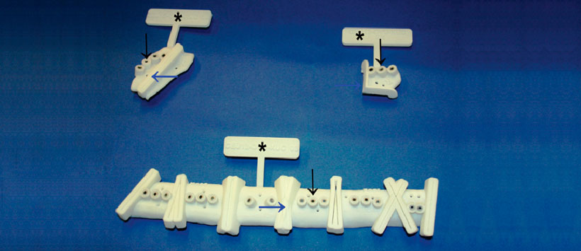 En el siguiente paso, las guías de resección las guías de corte para segmentos de peroné se diseñaron con CAD y luego se sinterizaron con láser a partir de poliamida biocompatible. Esto fue realizado solo por los ingenieros de software después de la sesión de planificación. El propósito de estas guías es transferir con precisión la planificación virtual de las osteotomías mandibulares y fibulares a la cirugía (Fig. 6 a 10).