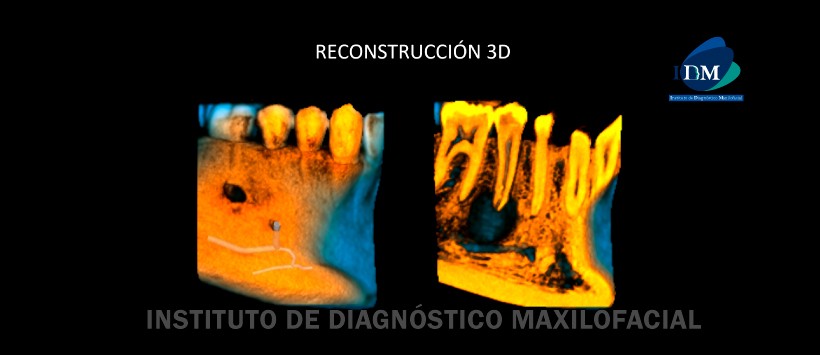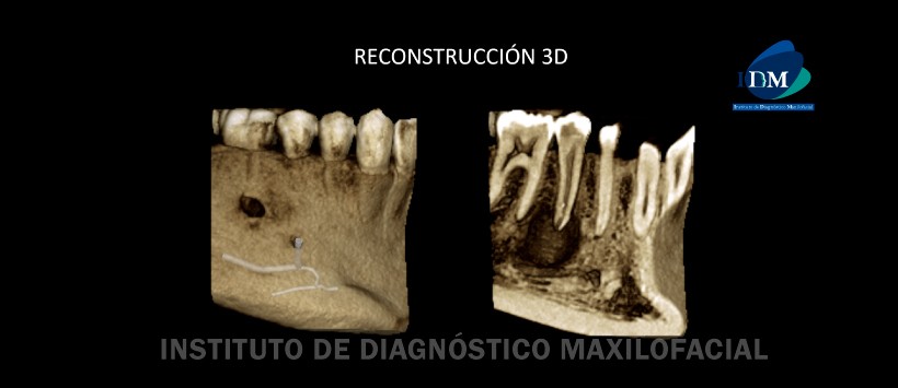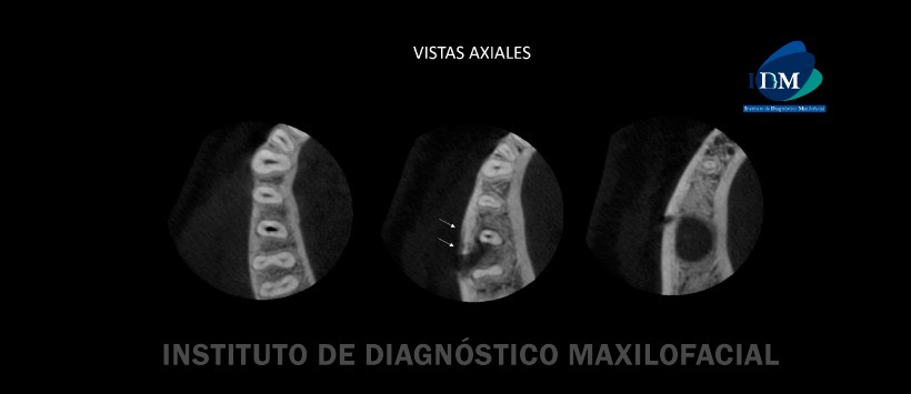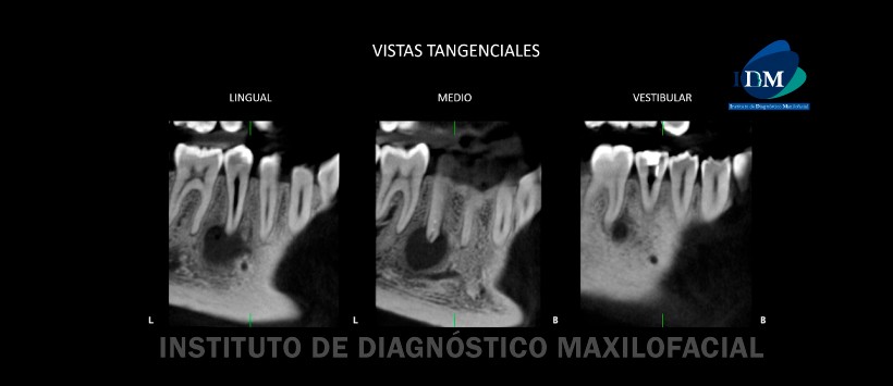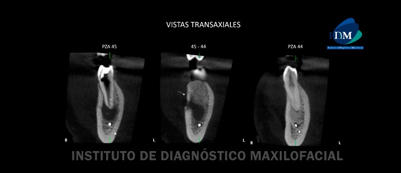 En la evaluación mediante la tomografía localizada se observa que la imagen previamente descrita tie ne una forma redondeada, comprometiendo ambas tablas óseas a predominio de la tabla vestibular. También se confirma el compromiso por parte del ápice y conducto de la pieza 45 así como la presencia de una leve reacción periostal en zona vestibular. (Figura 2, Figura 3 y Figura 4)
