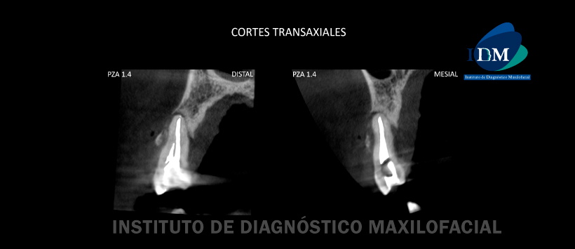 Posteriormente se opto por realizar una tomografía de campo reducido para evaluar mejor las piezas 14, donde las vistas axiales, tangenciales y transaxiales, se confirmó la anomalía dentaria de dicha pieza, así mismo se observó dos materiales de obturación en la raíz distal y uno en la mesial, los cuales convergen en uno solo al nivel del tercio apical. También se observa material de restauración en ambos segmentos coronarios. Finalmente se evidenció un proceso osteolítico perirradicular en toda la pieza dentaria, comprometiendo ambas tablas óseas ocasionando una probable perdida de soporte óseo. (Figura 2, Figura 3 y Figura 4)