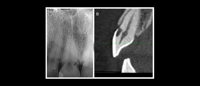 Figura 3: (A) Radiografía periapical típica de una imagen radiolúcida proyectado a nivel cervical en cara libre. (B) Una exploración CBCT que muestra reabsorción cervical invasiva a nivel cérvico-vestibular.