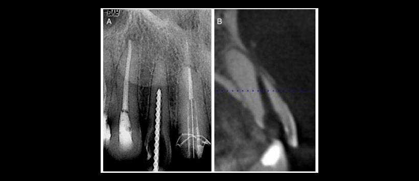 Figura 4: Radiografía periapical típica de una perforación de raíz en un incisivo superior. (A) Una imagen con lima K hasta la perforación. (B) Una exploración CBCT de la misma perforación de la raíz del diente.