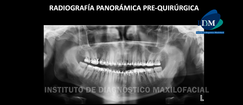 La Figura 1 muestra la radiografía panorámica pre-quirúrgica con la aparatología fija para ortodoncia bimaxilar y los pines quirúrgicos de fijación interdentarios.