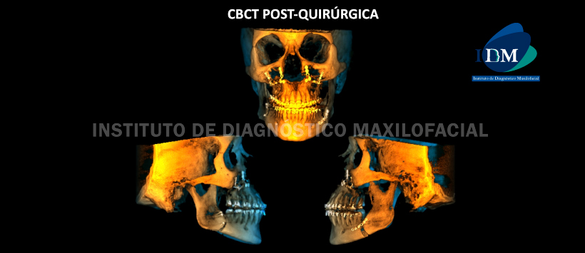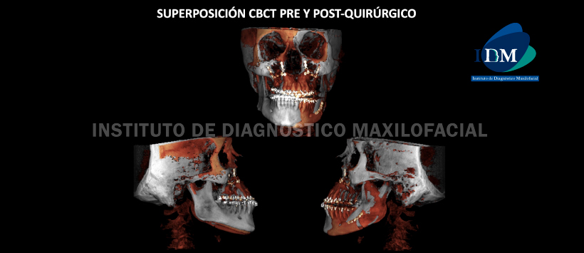 La tomografía volumétrica (CBCT) post-quirúrgica inmediata (Figura 8) de macizo cráneo facial y la superposición con la tomografía pre-quirúrgica (Figura 9) muestran las correcciones de las deformidades maxilofaciales concretadas en las zonas de no superposición (color gris para la posición inicial y color naranja para la posición final.