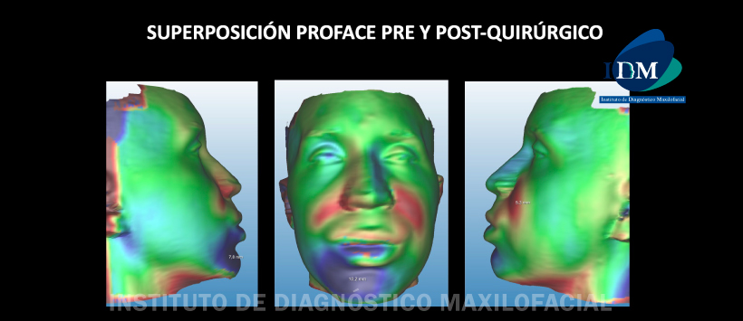 Se obtuvieron también los registros de fotografía 3D Proface (Planmeca) pre y post-quirúrgico (Figura 10), las cuales permiten realizar una valoración de los cambios faciales; a la superposición de ambas (Figura 11) se aprecia los mayores cambios faciales a nivel del tercio medio e inferior, así como la corrección de la asimetría (color azul muestra el mayor cambio facial de 10 mm a nivel del tercio inferior).