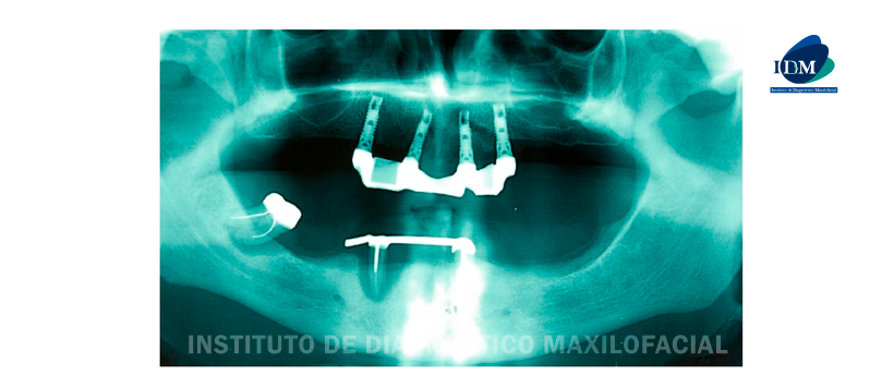 Los implantes se sumergieron y se dejaron en su lugar durante un período de tres meses. Una semana después, el paciente fue derivado a una consulta de emergencia por dolor facial. El examen clínico reveló inflamación difusa de la región submandibular, que era firme y dolorosa, con enrojecimiento de la piel. El paciente también informó parestesia labiomandibular.