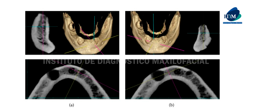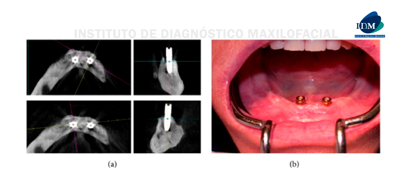 El historial dental anterior del paciente reveló extracciones del primer molar derecho mandibular y de ambos caninos mandibulares debido a lesiones periapicales, con legrado del tejido de granulación (Figura 1). Cinco meses después de las extracciones dentales, se propuso un proyecto terapéutico basado en implantes (Figura 2 (a)) y la Figura 2 derecha (b ) sinfisias mandibulares. Luego se colocaron dos implantes dentales osteointegrados.