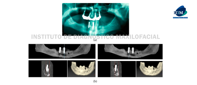 Una radiografía panorámica reveló una lesión osteolítica difusa radiotransparente con bordes mal definidos en el área de sínfisis de la mandíbula (Figura 3 (a)). La CBCT se realizó con urgencia para evaluar la lesión y reveló una osteólisis extensa, con destrucción de los bordes corticales en el área de los implantes. Los huesos alveolares y basales están afectados (Figura 3 (b)).