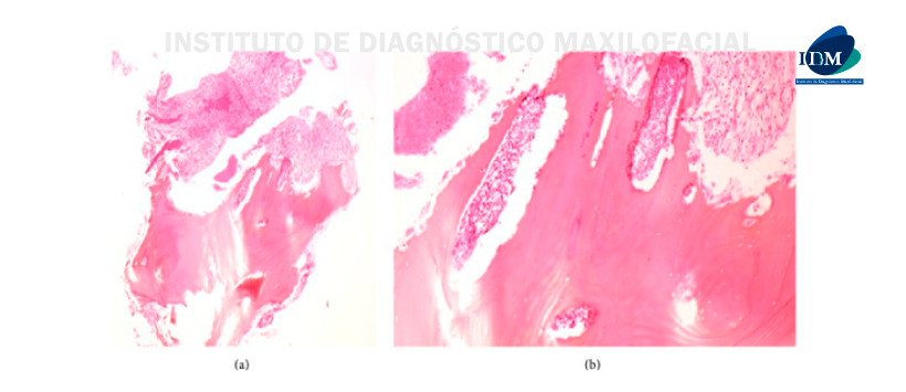 Se abrió la región mandibular afectada y se realizó una secuestrectomía de la región mental. El área fue completamente desbridada e irrigada, y los dos implantes dentales se dejaron en su lugar. Se envió una biopsia ósea para análisis de histopatología, que confirmó el diagnóstico de osteomielitis crónica con infiltración difusa de neutrófilos (Figuras 4 (a) y 4 (b)). Un microbiólogo también utilizó cultivo celular para identificar la bacteria Streptococcus intermedius.
