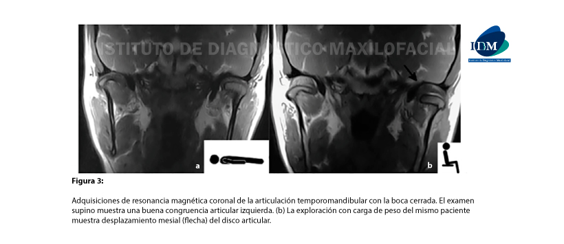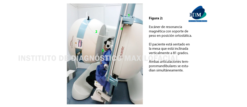 El uso de IRM dinámica de control de peso (RMCP) para la evaluación del movimiento de la ATM aún no se ha encontrado como validación oficial porque se considera una técnica innovadora, pero aún puede proporcionar información clínica útil en comparación con otras técnicas dinámicas funcionales, como la condilografía y la ecografía dinámica. Las expectativas clínicas de la RMCP también están respaldadas por estudios recientes sobre la columna lumbar y otros trastornos que aparecen de manera diferente en las investigaciones clinostáticas. Los pacientes con trastorno de la articulación temporomandibular pueden estudiarse en un escáner abierto de resonancia magnética de campo bajo en posición sentada. En esta condición, puede reproducir un entorno que se asemeja a la vida cotidiana y revela cambios en la unidad de ATM que pueden no ser evidentes con los estudios en posición supina.