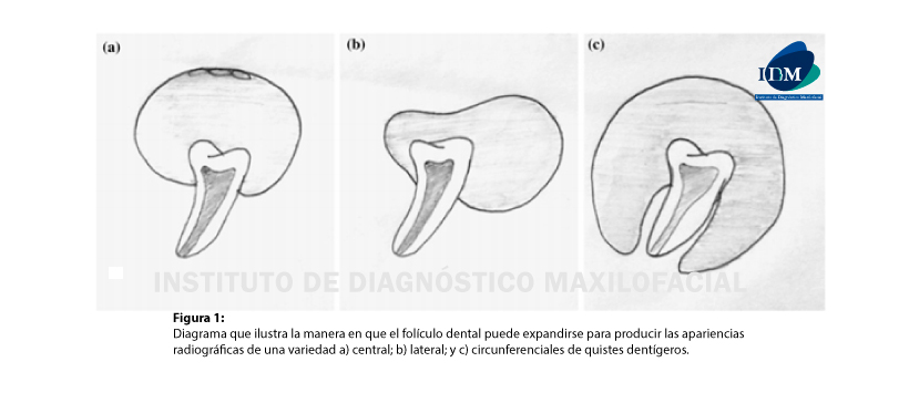 Figura 1: Diagrama que ilustra la manera en que el folículo dental puede expandirse para producir las apariencias radiográficas de una variedad a) central; b) lateral; y c) circunferenciales de quistes dentígeros.
