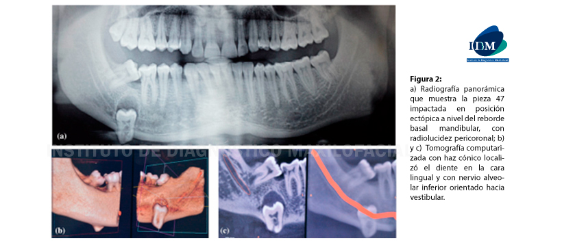 Figura 2: a) Radiografía panorámica que muestra la pieza 47 impactada en posición ectópica a nivel del reborde basal mandibular, con radiolucidez pericoronal; b) y c) Tomografía computarizada con haz cónico localizó el diente en la cara lingual y con nervio alveolar inferior orientado hacia vestibular.