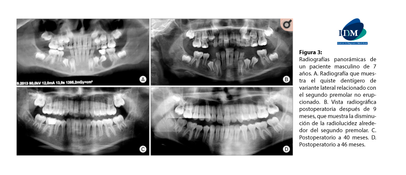 Figura 3: Radiografías panorámicas de un paciente masculino de 7 años. A. Radiografía que muestra el quiste dentígero de variante lateral relacionado con el segundo premolar no erupcionado. B. Vista radiográfica postoperatoria después de 9 meses, que muestra la disminución de la radiolucidez alrededor del segundo premolar. C. Postoperatorio a 40 meses. D. Postoperatorio a 46 meses.