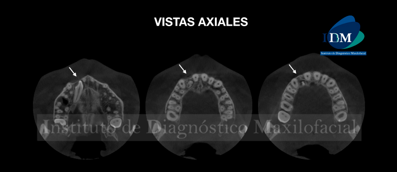 Posteriormente en la tomografía volumétrica de haz cónico se confirma los previamente descritos así como el segmento coronario de la pieza 12 esta en estrecha relación con el ápice de la pieza 11, así mismo esta ubicado en la posición equidistante en relación con las tablas oseas al igual que la pieza supernumeraria. Finalmente cabe resaltar que el segmento radicular de la pieza 12 esta en estrecha relación con el piso de fosa nasal derecha. (Figura 2 y Figura 3 y Figura 4)