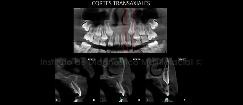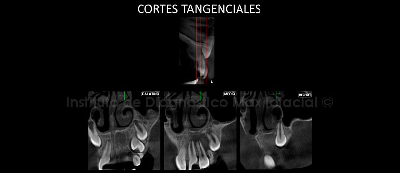 La tomografía computarizada de haz cónico, mediante los cortes transaxiales y tangenciales, nos muestra la presencia de una lesión osteolítica de límites difusos que ocasiona la erosión de ambas tablas óseas asociadas al aumento de volumen del tejido blando circundante. Se debe descartar Osteomielitis. (Fig. 2 y 3).