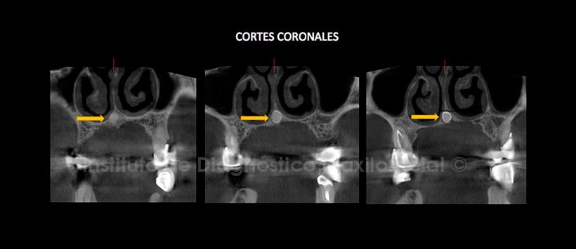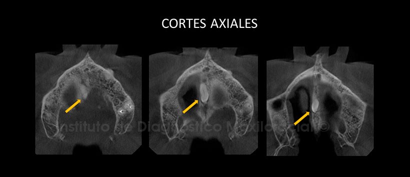 A la evaluación de la tomografía volumétrica (CBCT) en cortes axiales (Figura 2), coronales (Figura 3) y sagitales (Figura 4), se evidencia pieza supernumeraria ectópica retenida a nivel de la sutura media palatina con la corona y raíz orientada entre el paladar duro y el piso de fosa nasal.