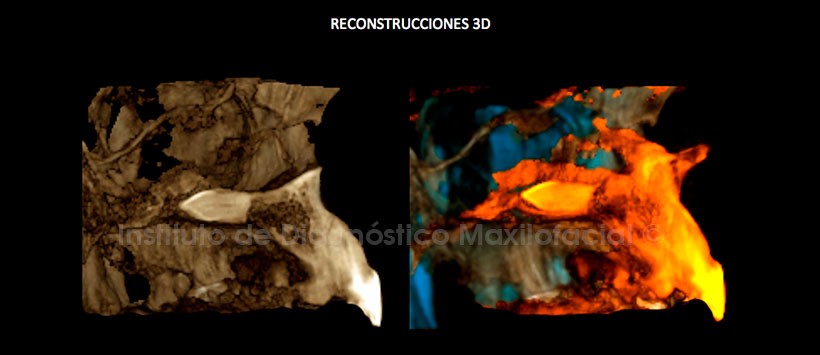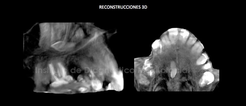 En las reconstrucciones 3D se observa claramente a la pieza 1.3 retenida en el paladar duro y su relación con las estructuras adycantes. (Figura 6)