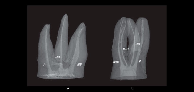 Fig 1. Microtomografías computarizadas de dos primeras molares maxilares. En A) se observa el cuarto conducto (MB2) completamente independiente del conducto mesiovestibular (MB1) y se complican aún más por un canal accesorio en el ápice; a pesar de la alta resolución, la conexión interna completa presentes entre los tercios medio y apical se reproduce sólo parcialmente. B) se observa que el cuarto conducto (MB2) se une al conducto mesiovestibular (MB1) en el tercio medio de la raíz, creando así una amplia ‘laguna’ apical a la conjunción.