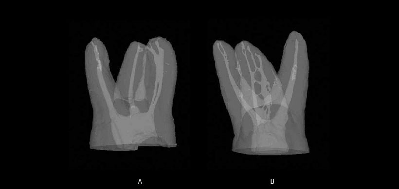 Fig 2. Microtomografías computarizadas de dos primeras molares maxilares. En A) se observa un solo canal en la raíz mesiovestibular, que se aplana en los tercios coronal y medio mientras que muestra un delta en el extremo apical. B) la raíz mesial con dos canales de la raíz completamente separadas. MB1 tiene dos conductos accesorios en el extremo apical, mientras que el canal MB2 se complica aún más por un bucle en el tercio apical; a pesar de la alta resolución, las conexiones internas completas presentes en los tercios medio y apical se reproducen sólo parcialmente.