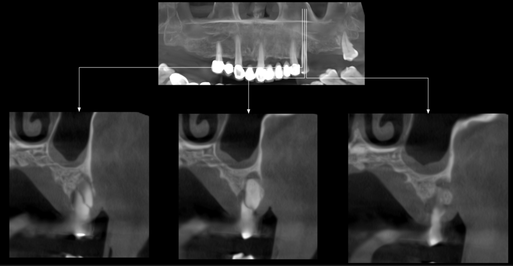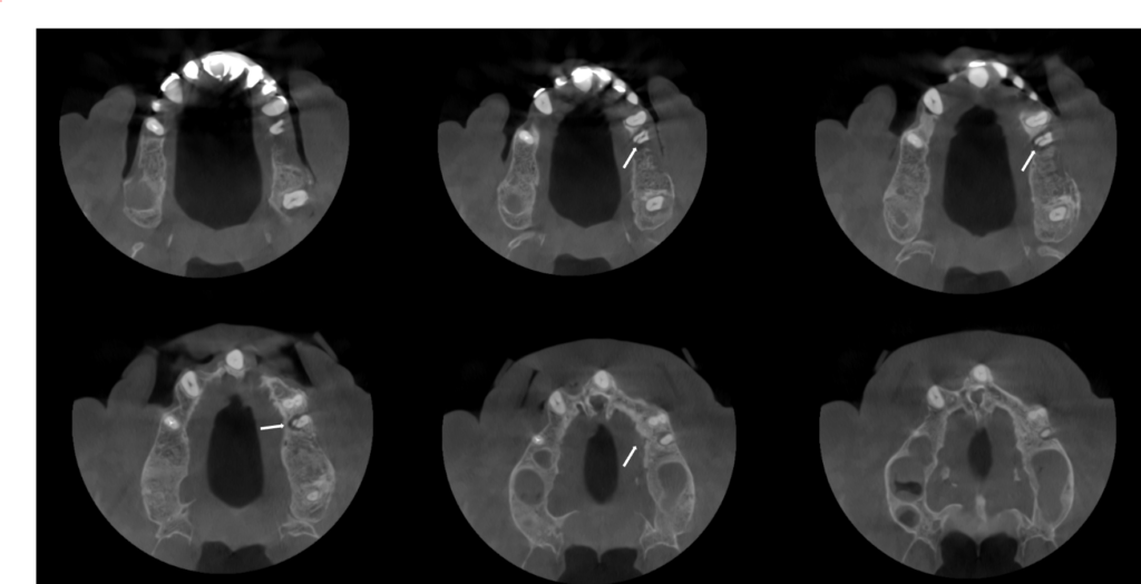 Desde una perspectiva imagenológica, las fracturas radiculares pueden observarse como líneas radiolúcidas en radiografías convencionales; sin embargo, su visualización está limitada por la superposición anatómica y la orientación del haz de rayos X, lo que reduce su sensibilidad diagnóstica en comparación con métodos tridimensionales (1, 2). Estudios sistemáticos han demostrado que la radiografía convencional presenta menor precisión para detectar fracturas radiculares, mientras que la tomografía computarizada de haz cónico (CBCT) ofrece mayor sensibilidad y especificidad diagnóstica al permitir la visualización del trazo de fractura en múltiples planos y reconstrucciones (1-3). En CBCT, la fractura puede aparecer como una línea hipodensa que recorre la raíz en diversos planos (axial, transaxial, sagital y reconstrucción 3D), definiéndose por la detección de una separación de los segmentos radiculares adyacentes en al menos dos secciones contiguas y en al menos dos planos tridimensionales que facilitan la identificación de la extensión del trazo y de los cambios óseos asociados, como defectos osteolíticos perirradiculares y adelgazamiento cortical (1,2) El uso de reconstrucciones volumétricas tridimensionales mejora además la comprensión espacial del trazo de fractura y la relación con las estructuras adyacentes, permitiendo un diagnóstico más certero en comparación con técnicas bidimensionales (1–3).
