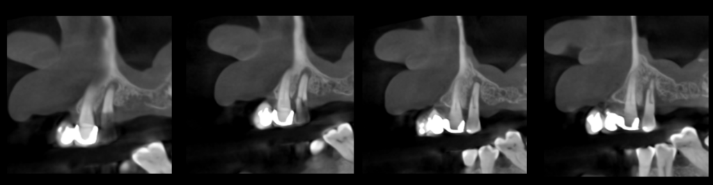 En la tomografía computarizada de haz cónico (CBCT) de ambos maxilares, evaluada mediante cortes axiales (Figura 2), transaxiales (Figura 3) y tangenciales (Figura 4), se observó una línea hipodensa de trayecto sinuoso que se extendía desde la superficie cervicovestibular hacia el tercio apical radicular palatino, comprometiendo el conducto radicular. Asimismo, se evidenció un proceso osteolítico perirradicular y pararradicular en el tercio medio radicular palatino, que ocasionaba adelgazamiento de la cortical de la tabla ósea.