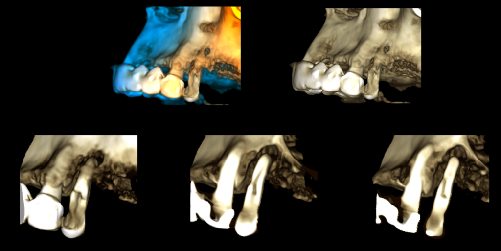 En la reconstrucción tridimensional (3D) se evidenció con mayor claridad el trazo de fractura radicular diagonal correspondiente a la pieza 24 (Figura 5).